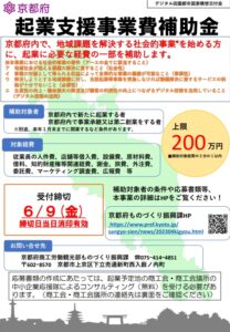 京都府では、地域課題の解決に効果的な起業の促進を通して地方創生を実現することを目的に、新たに社会的事業を京都府内で起業する者や新たに事業承継又は第二創業する者に対して、起業等に要する経費の一部を助成する「起業支援事業費補助金」の募集を開始します。