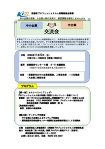 京都府プロフェッショナル人材戦略拠点では、京都府内中小企業の成長戦略を実現する人材確保を支援しています。中小企業の経営課題等の解決に向けた取組として、大企業に在籍する人材(プロフェッショナル人材)を出向あるいは副業等により、活用していただくための交流会を開催いたします。